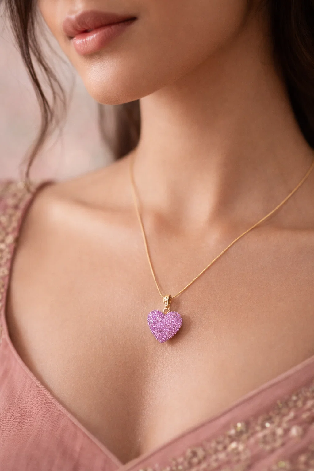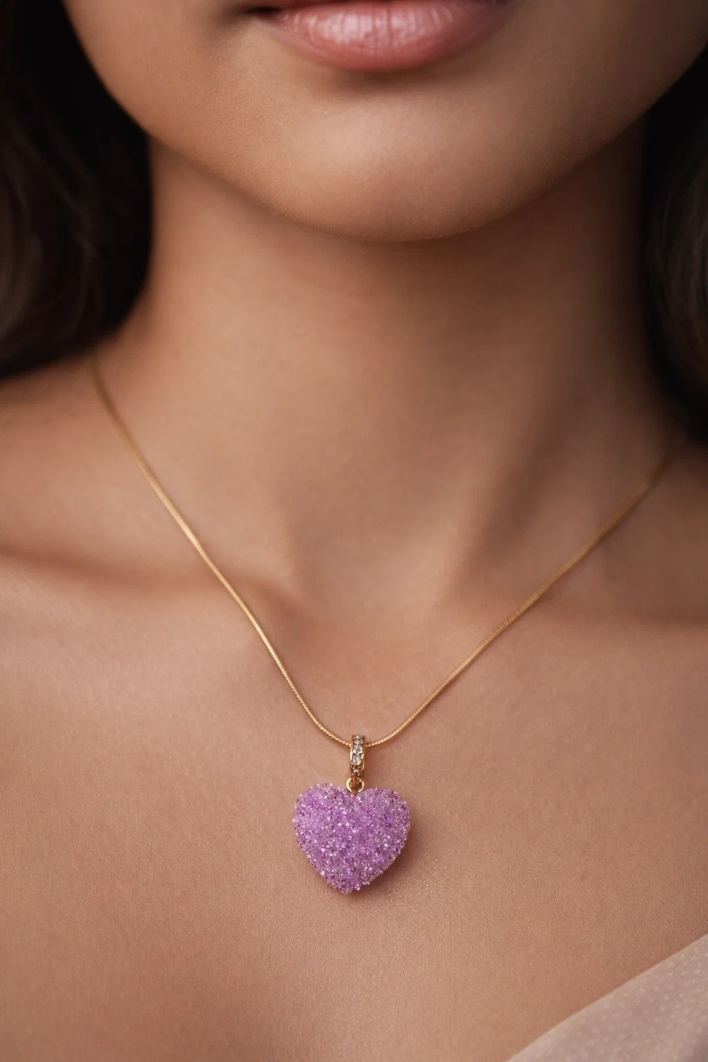 Designed with attention to detail, the Lavender Love Pendant features a finely polished bail paired with a sleek gold-tone chain for a timeless, luxurious look. The pendant’s crystalline texture adds depth and brilliance, giving it a high-end feel while remaining lightweight and comfortable. Built to last, this piece maintains its glow and charm, making it a reliable addition to any jewelry collection.