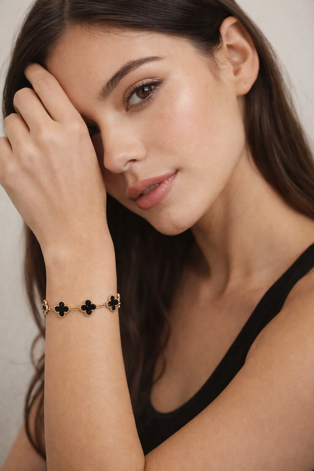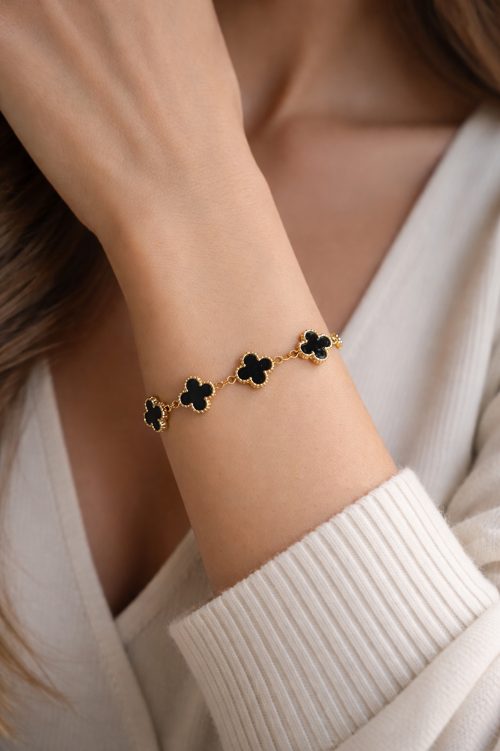 From workdays to weekend celebrations, the Midnight Clover Bracelet complements nearly every wardrobe. The subtle yet eye-catching design pairs effortlessly with gold jewelry, stacked bracelets, watches, or evening wear. Its sophisticated black and gold color combination makes it a versatile accessory that enhances both modern fashion and timeless elegance.