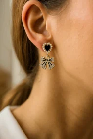 Crafted with a radiant gold-tone finish, these heart and bow earrings deliver a luxurious look without being overpowering. The shimmering stones catch the light beautifully, creating a refined glow that complements both modern and classic styles. Whether paired with a cocktail dress or a soft blouse, these elegant drop earrings elevate your ensemble with timeless sophistication.